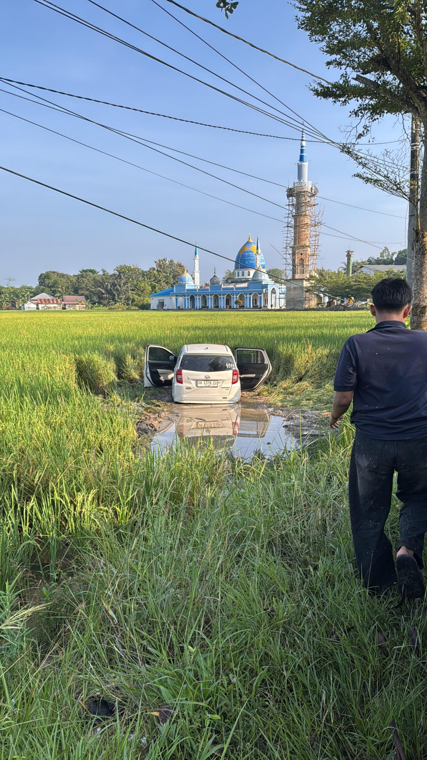 Kendaraan berwarna putih jenis Daihatsu Sigra tersebut diduga keluar jalur dan masuk ke area persawahan akibat pengemudi mengantuk saat berkendara.